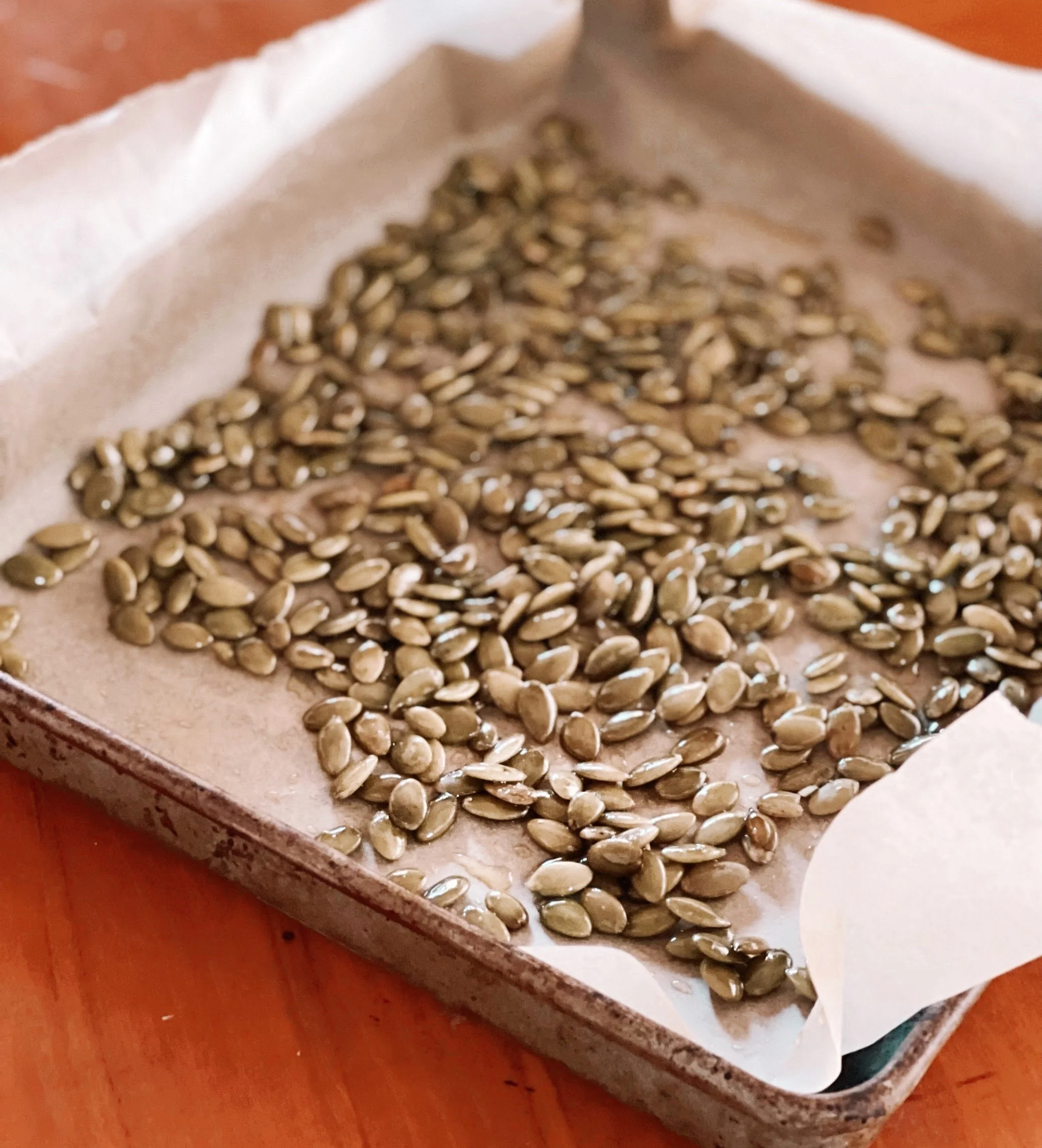 To roast the seeds: toss 1 c pumpkin seeds in olive oil and a sprinkle of salt. Roast at 325o for up to 25 minutes. Keeping an eye on them, stirring every 10 minutes, remove once the seeds are slightly browned and have a lightly toasted fragrance.